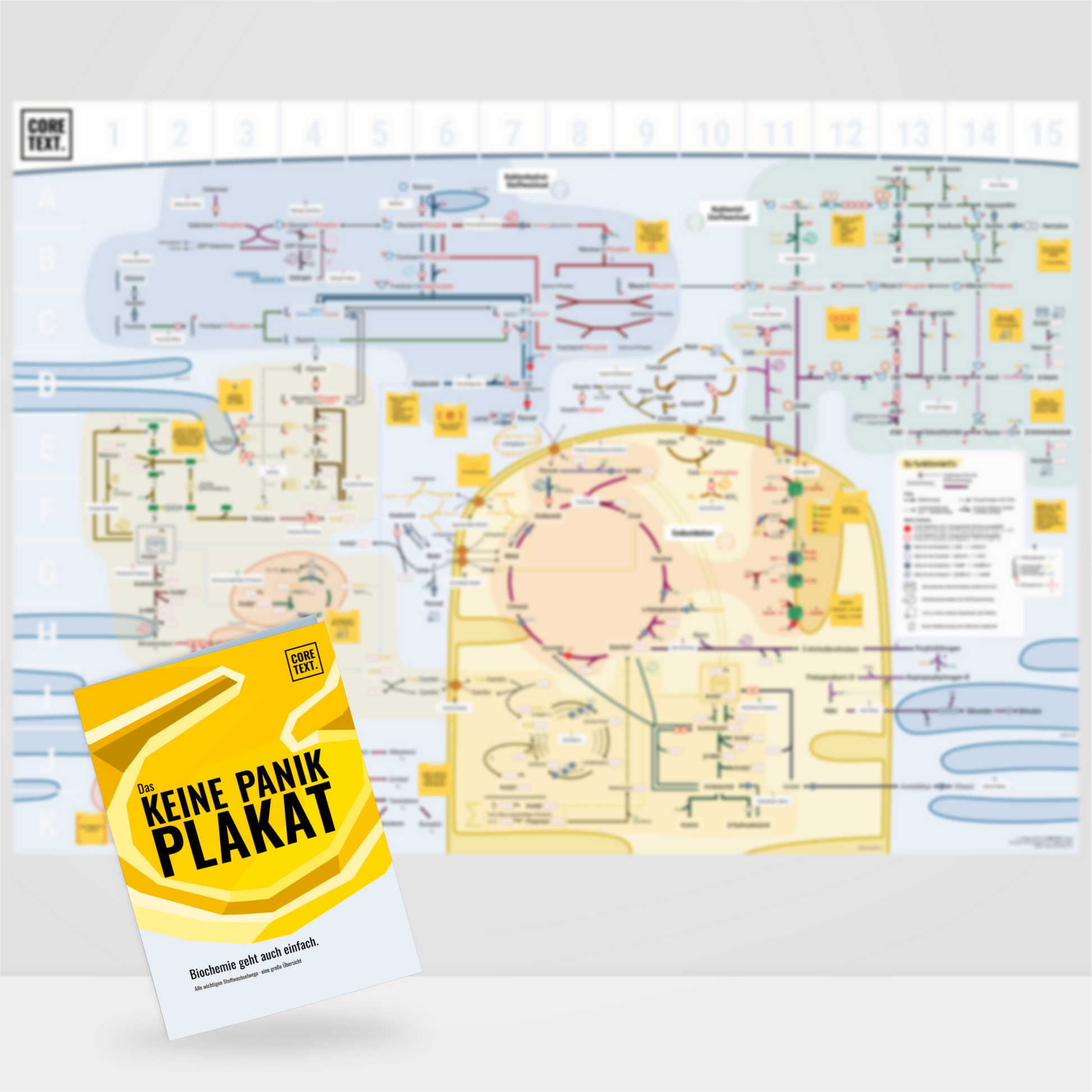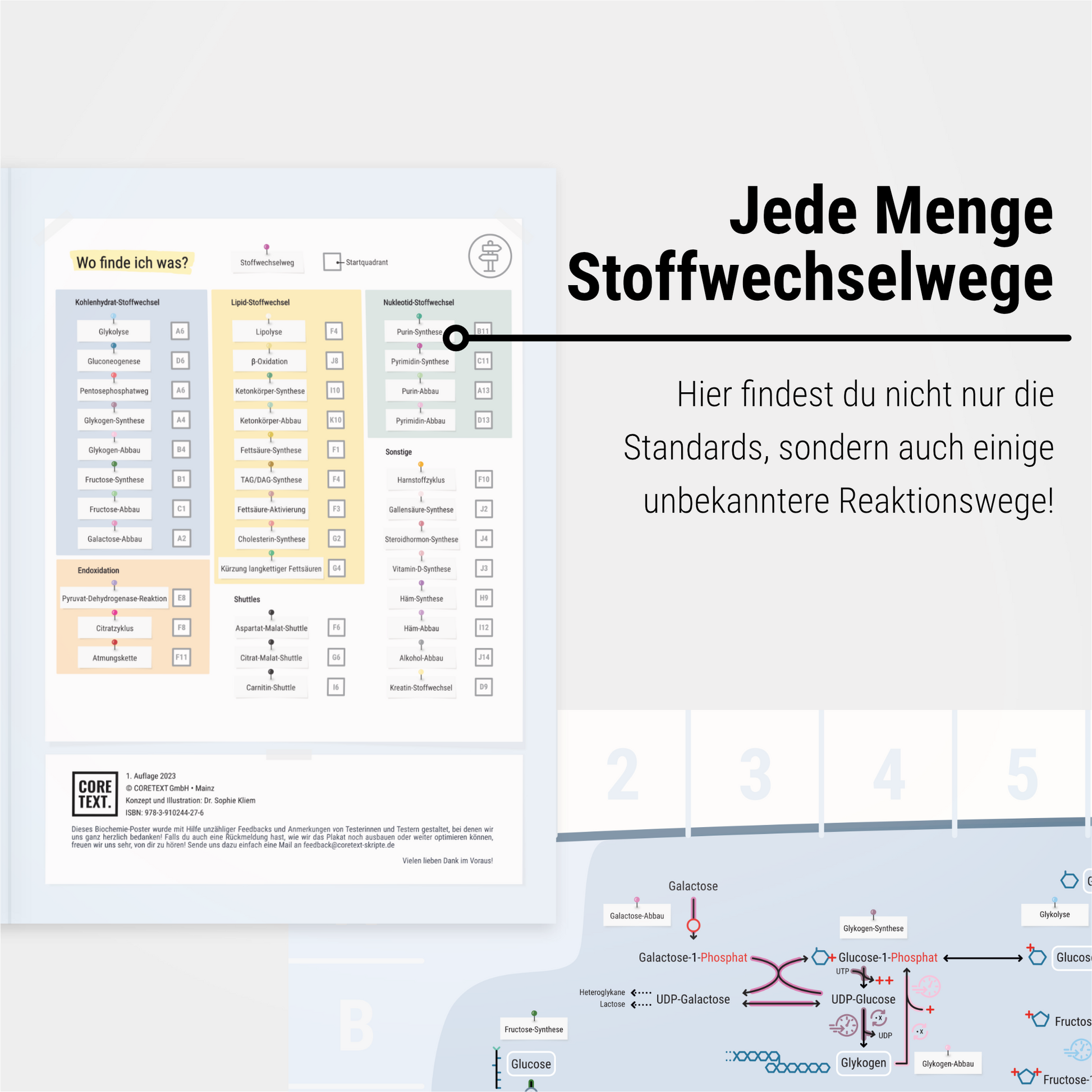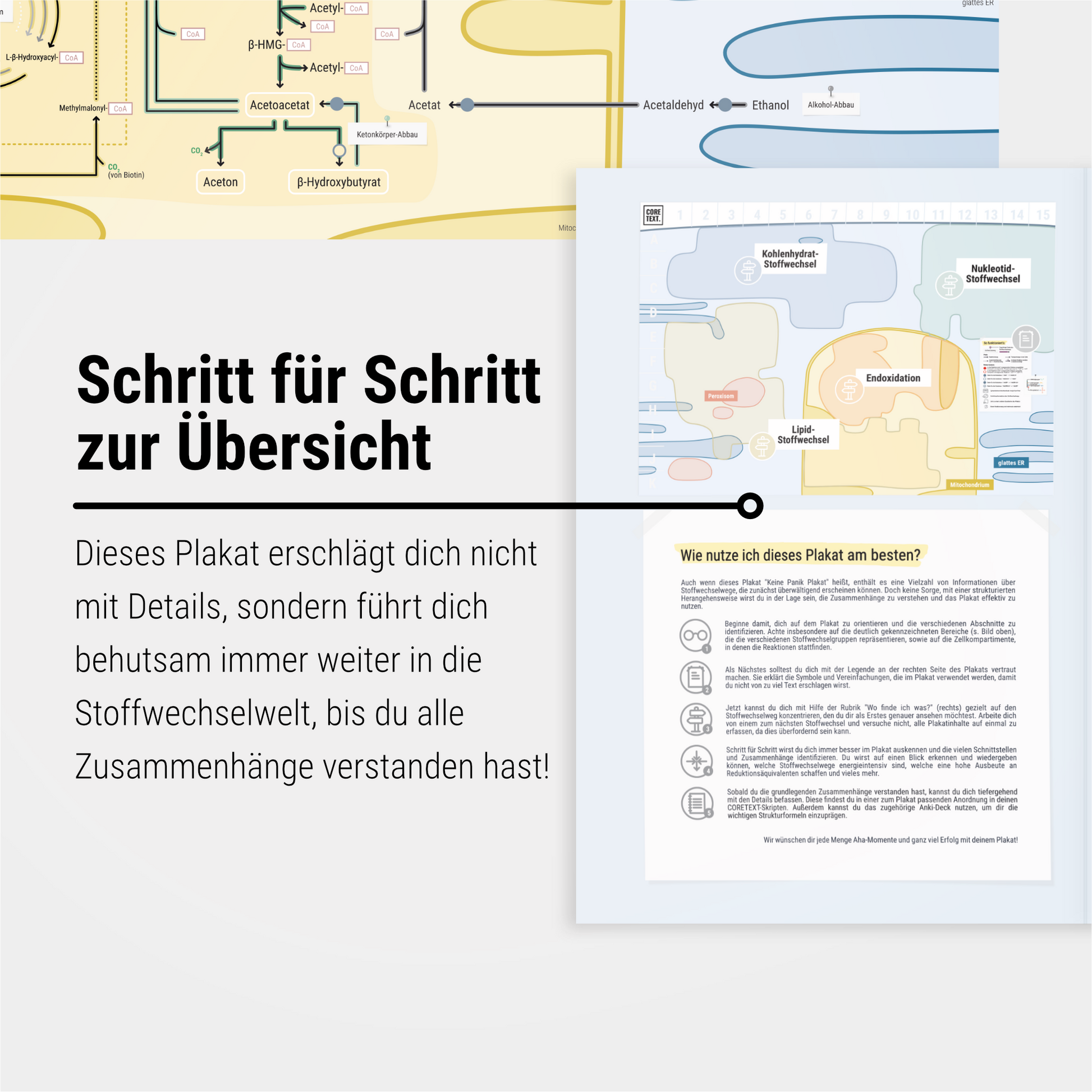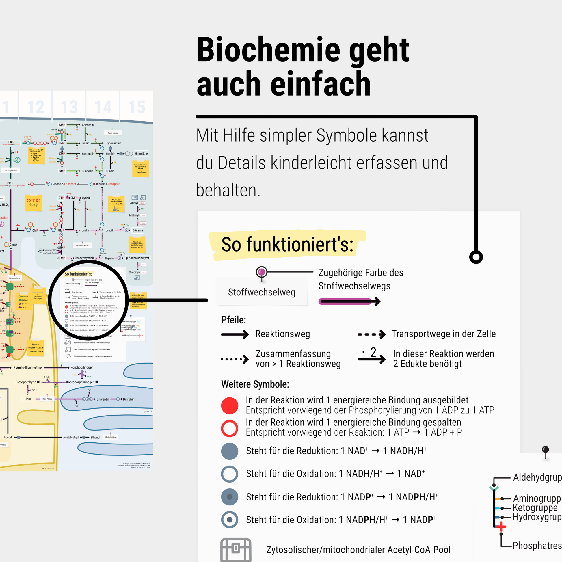 Biochemie geht auch einfach. Dir das zu zeigen, ist Aufgabe und Inhalt dieses Plakats. Mit einer genauen Anleitung, vielen simplen Symbolen statt winzigkleinem Text und einem klaren Farbkonzept bekommst du im Handumdrehen eine genaue Übersicht über mehr als 30 Stoffwechselwege!